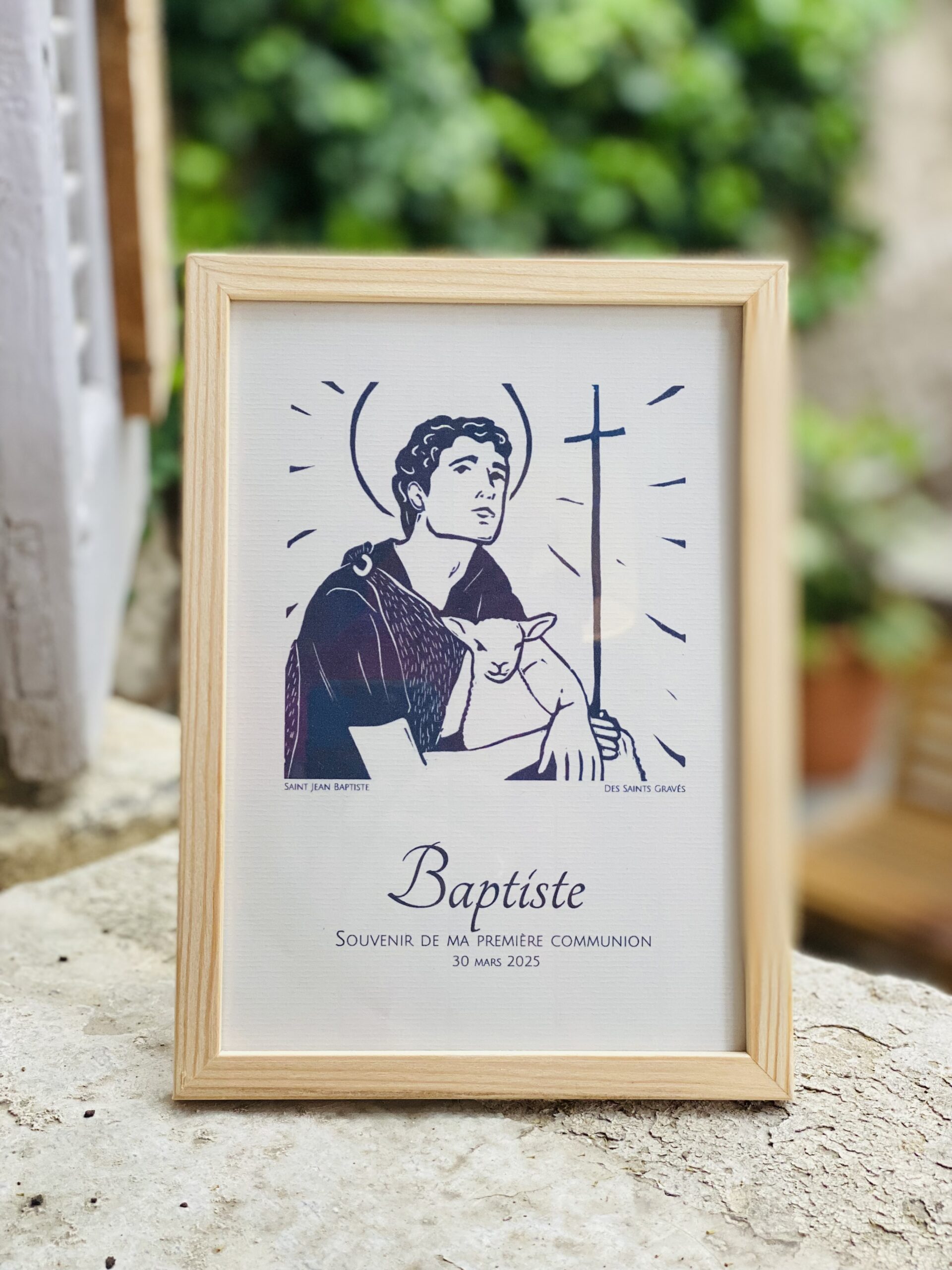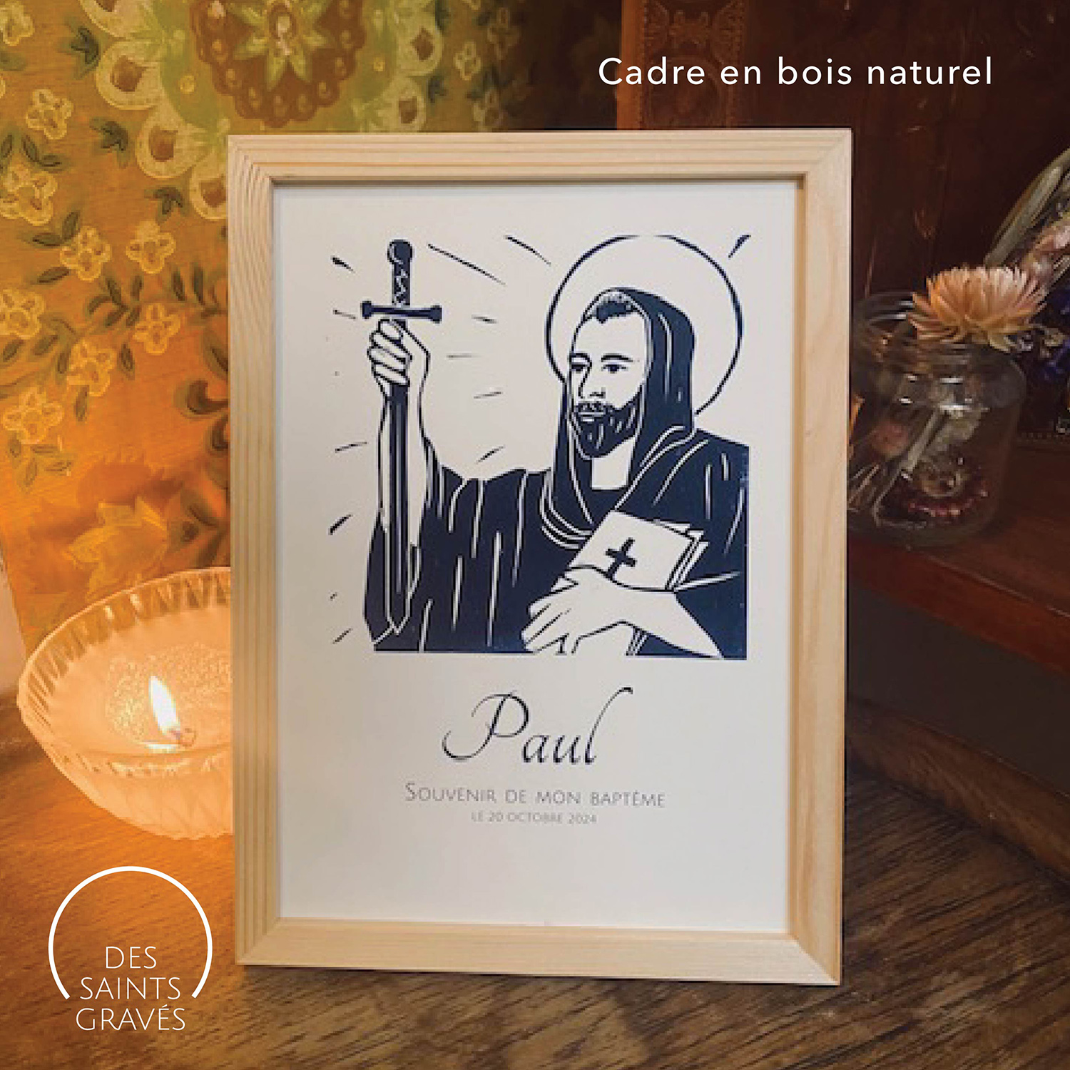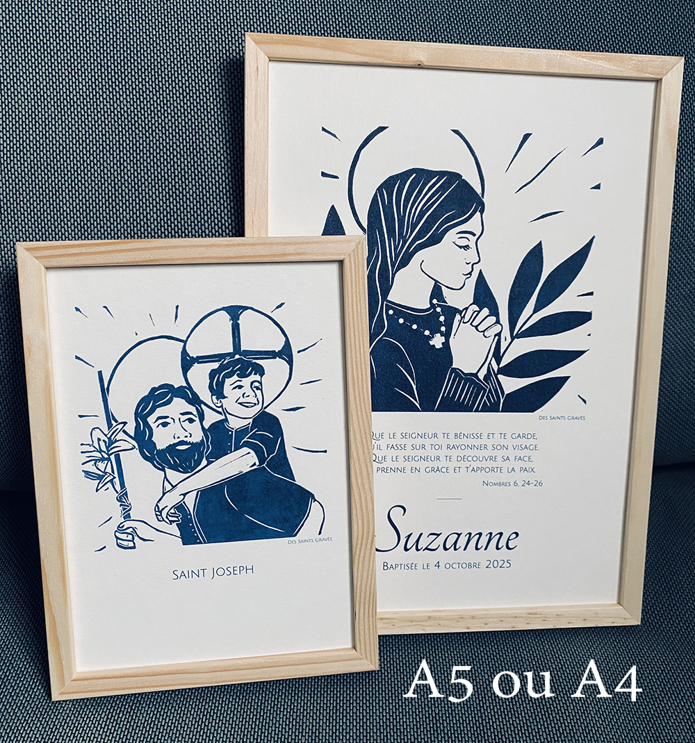 Sous le regard bienveillant d’un Saint protecteur, votre affiche réunit une prière choisie avec amour, le prénom de l’enfant et la date sacrée de son baptême, de sa communion ou de sa confirmation.