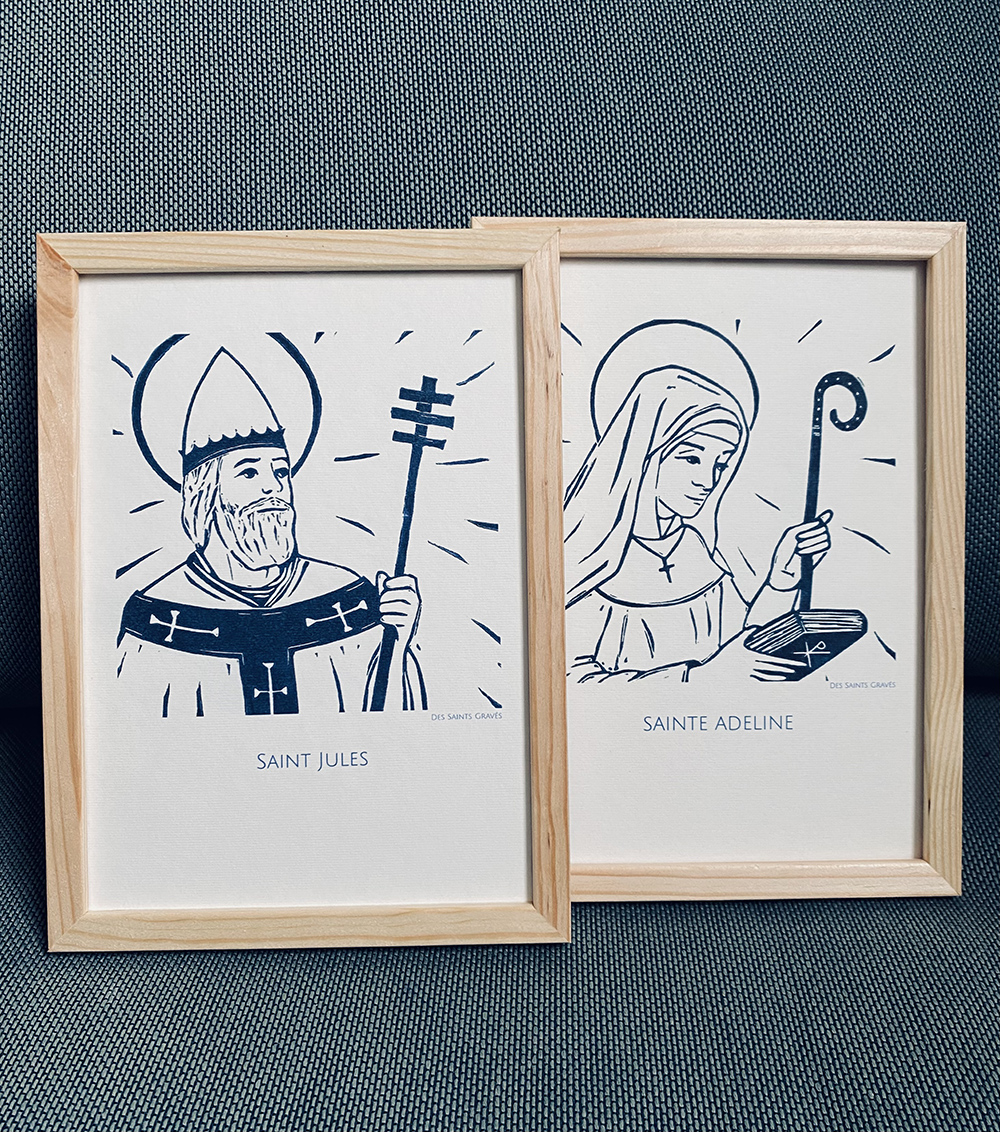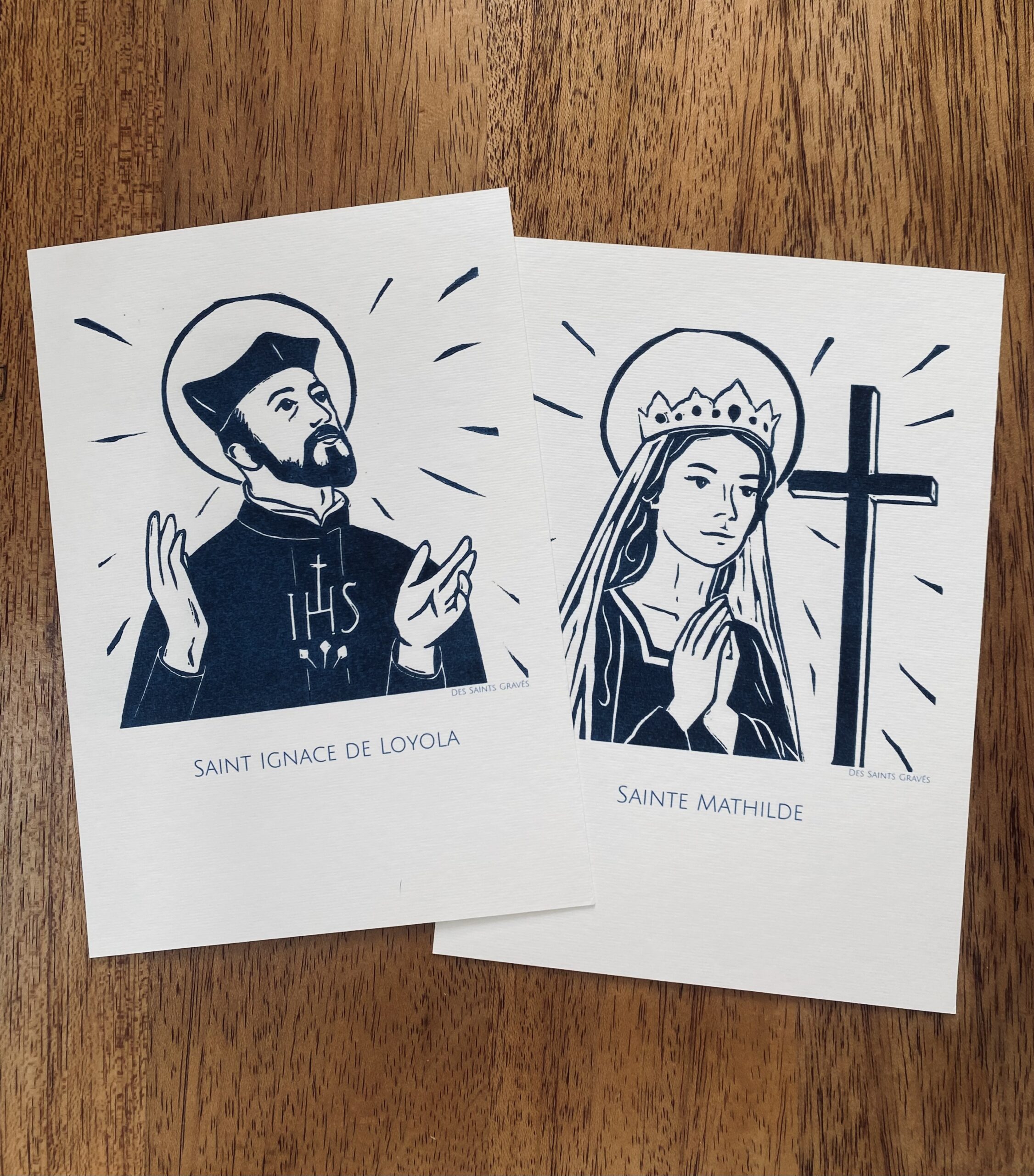 Un portrait de Saint en linogravure, impression numérique. Format A5, sur un papier 300g mat texturé.