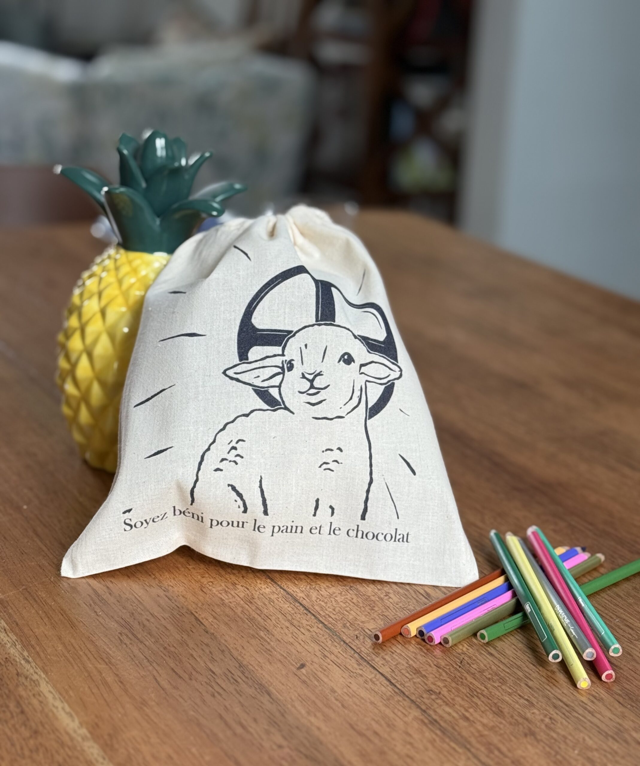 Apportez une touche de foi et de douceur à votre quotidien avec ce joli pochon illustré de l’image de l’Agneau de Dieu.